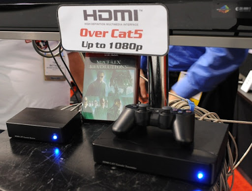 Wireless HDMI、HDMI over CAT5 or COAX HDMIのエクステンダー、無線で飛ばすものや、CAT5のケーブルに変換するものなどなど。HDMIのケーブルは5mや10mとなると数万円もするので...信号を劣化させずにCAT5(LANケーブル)や光ファイバ、COAXケーブルに変換して飛ばす機器が出ています。昨年はT-Zeroと同技術を使った数社の展示(ビルゲイツが野球帽を被ってこっそりブースを訪問していた。)であったけれど、今年は何社かから同種の技術が展示...